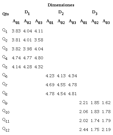 La Tabla 6 muestra los resultados de las diferentes dimensiones y períodos, donde muestra los valores de las escalas para cada pregunta formulada en el cuestionario. Para la D1, para los períodos A01, A02 y A03, los valores de escala están en un rango de 3.81 - 4.74, 3.98 - 4.28 y 3.58 - 4.80 respectivamente. Para la D2, para los períodos de A01, A02 y A03, las escalas de valores están en un rango de 4.23 - 4.78, 4.13 - 4.55 y 3.58 - 4.80 respectivamente. Para la D3, para los períodos de A01, A02 y A03, las escalas de valores están en un rango de 2.02 - 2.44, 1.74 - 1.85 y 1.62 - 2.19 respectivamente.