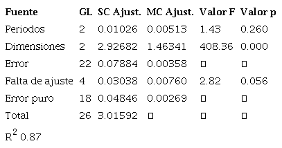 c) Para determinar los efectos significativos de los parámetros de los diferentes periodos y sus dimensiones respectivas, se empleó el diseño de ANOVA con arreglo factorial (IC 95 % y α ≤ 0.05), para la representatividad del modelo generado se trabajó en error puro, falta de ajuste y coeficiente de determinación.