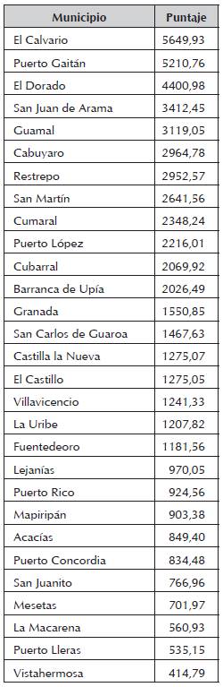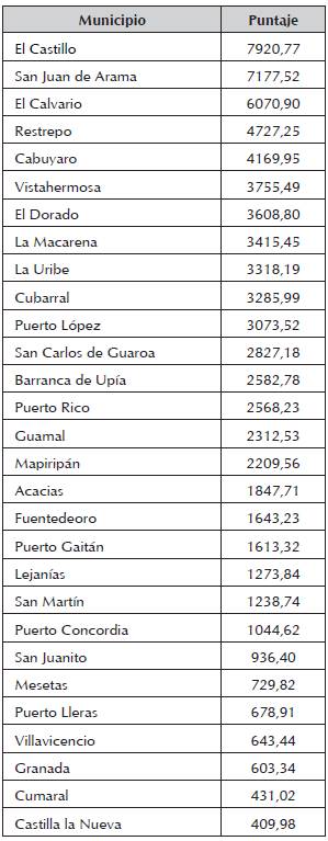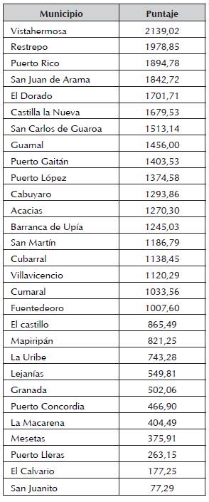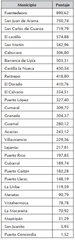 En la tabla 1 se evidencia los municipios en orden descendente según el puntaje obtenido en el indicador sintético para el factor ambiental calidad, acceso y manejo del recurso hídrico, evidenciando el grado de afectación de los municipios según el impacto en salud relacionada con el recurso hídrico.