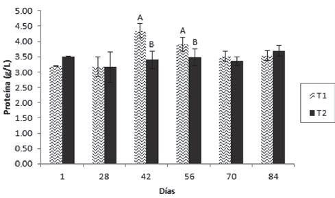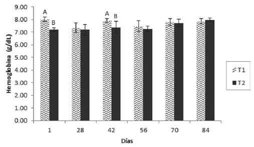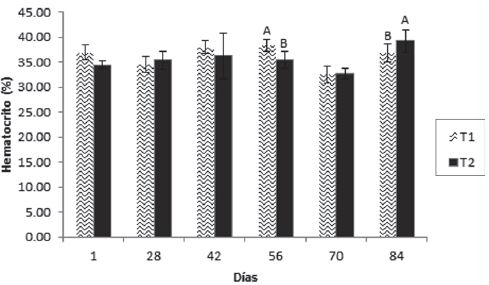Los resultados mostraron que el hematocrito presentó diferencia significativa entre los tratamientos en los días 56 y 84, siendo superior en T1 en el día 56 e inferior en el día 84 (Figura 1). La hemoglobina (Figura 2) fue superior en el T1 en los días 1 y 42, no existiendo diferencias entre los tratamientos en los demás tiempos de muestreo. Por otro lado, la proteína plasmática tuvo un aumento significativo en el T1 el día 42 el cual se mantuvo hasta el día 56, volviendo a la normalidad en el muestreo posterior (día 70) y manteniéndose así hasta el final del ensayo (Figura 3).