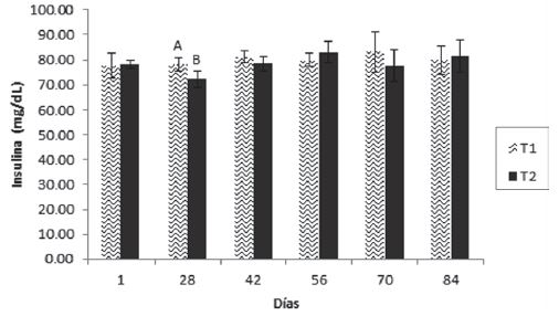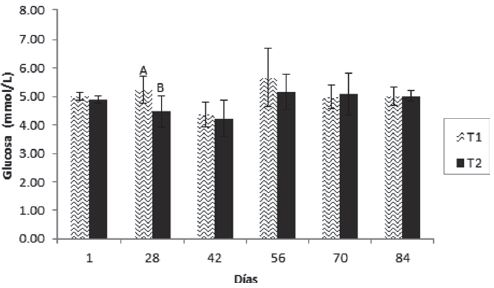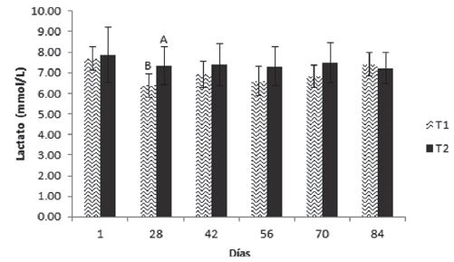 Respecto a la glucosa (Figura 4), la insulina (Figura 5) y el lactato (Figura 6), se presentaron diferencias significativas el día 28, en el cual las dos primeras fueron superiores en el T1, mientras que el lactato lo fue en el T2.