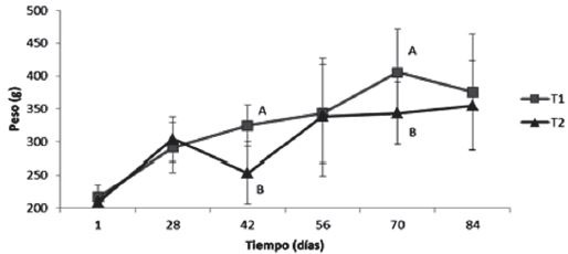 Aunque se presentaron diferencias significativas en peso los días 42 y 70 y en longitud (total y estándar) el día 42, al final del experimento no hubo diferencias significativas entre los tratamientos en ninguna de las dos variables (Tabla 4). Un comparativo del peso entre los tratamientos en cada día de muestreo se presenta en la Figura 7.