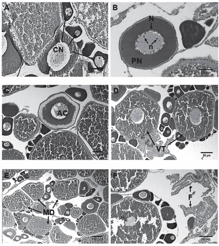 Oocitos vitelogénicos: Estas células (184,94 ± 2,65 µm) presentan gránulos de vitelo acidófilos redondos con tamaños variados y que ocupan la mayoría del citoplasma. Presentan un núcleo central (79,84 ± 17,43 µm) con nucléolos en la periferia y la membrana basal se torna más delgada, alrededor de ella se denota la teca (Figura 2D).