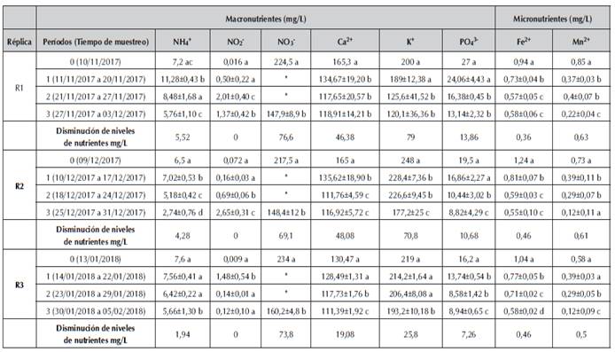 Durante las tres semanas de cultivo en cada una de las réplicas del experimento no se observaron síntomas por deficiencia de nutrientes en las plantas y se encontró una disminución de los macro y micronutrientes, mostrando diferencias significativas de p > 0.05 entre las semanas del cultivo. Se observó una mayor asimilación por la planta de nitrato (NO3-) con 76.6, 69.1 y 73.8 mg/L, seguido de potasio (K+) con 79, 70.8 y 25.8 mg/L; calcio (Ca2+) con 46.38, 48.08 y 19.08 mg/L; fosfato (PO43-) con 13.86, 10.68 y 7.26 mg/L; manganeso (Mn2+) con 0.63, 0.61 y 0.5 mg/L e hierro (Fe2+) con 0.36, 0.46 y 0.46 mg/L para la réplica 1, 2 y 3 de cada nutriente respectivamente (Tabla 2). Con respecto al amonio (NH4+) y nitrito (NO2-), se observó para el amonio una variación de los datos durante las tres semanas de cada réplica y el nitrito aumentó en el transcurso de las semanas.