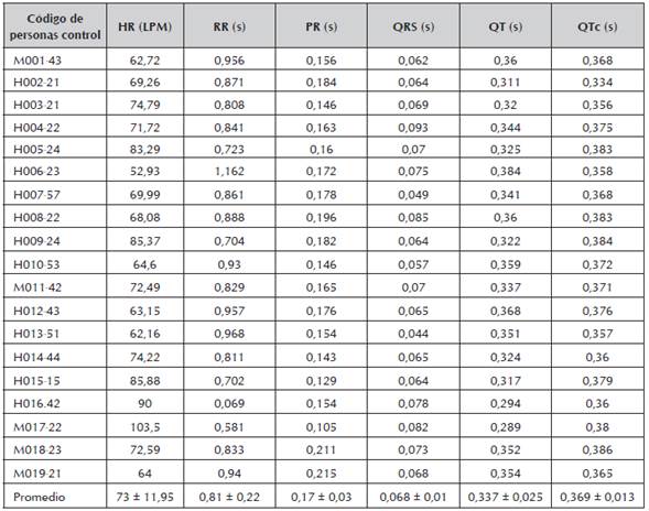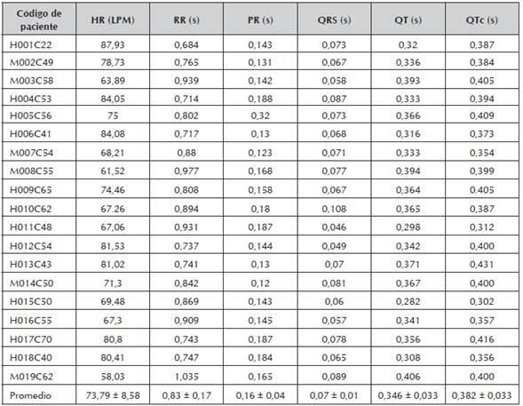 Las tablas 3 y 4 muestran los promedios de las variables electrocardiográficas medidas en cada uno de los grupos.