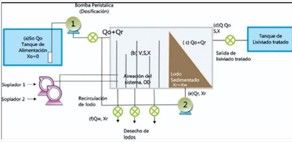 Una vez tratados los lixiviados, se clarifican en el sedimentador y pasan al flujo de salida (d) a través de una abertura transversal en la parte superior del mismo, controlando que sea igual al caudal de entrada para conservar condiciones estacionarias en el sistema. Los lodos que se decantan pasan a una línea de recirculación (e), que consiste en una manguera de poliuretano y se envían al reactor nuevamente a una Tasa de Recirculación regulada, impulsados por una bomba peristáltica con potencia máxima de 75l/h. Por último, se instaló en la parte inferior del reactor llaves de paso de ½ pulgada para el flujo de purga (f), con el objeto de regular el tiempo de residencia celular del sistema.