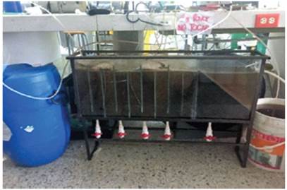 Construcción y puesta en marcha del RFP. El modelo físico se representa esquemáticamente en la figura 1 y consta básicamente de un flujo de alimentación de lixiviados (a) que entra a un tanque rectangular de vidrio con dimensiones 0,60 m de largo, 0,25 m de ancho y 0,35 m de altura total, con un volumen útil de 50 L, de los cuales 37,5 L corresponden al reactor o tanque de aeración (b) y 10,5 L al sedimentador (c). La aeración se realizó mediante difusión a través de una manguera de silicona de 4mm de diámetro con orificios, insertada en el fondo de la cámara de aireación y conectada a 2 bombas aireadoras tipo mouse marca POWER LIFE P-500 con doble salida y 2,7 W de potencia.