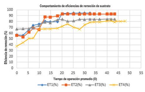 En la figura 3 se aprecia que para las condiciones de operación de las etapas 1 y 2 se logró la estabilización del sistema a partir de los 20 días de operación, alcanzándose eficiencias superiores al 90% (eficiencia promedio de 94.6% para Et1 y 92.8% para Et2). Para la etapa 3 aunque el sistema alcanzó regularse alrededor de 30 días de operación la eficiencia de remoción promedio no superó el 84%; igualmente, la etapa 4 con tiempo de retención de 5 días presentó mayor inestabilidad y tardó 35 días para alcanzar el estado estacionario propio de sistemas continuos con un máximo de 80% de remoción. Comparando los valores de remoción obtenidos con los valores típicos de remoción para aguas residuales domésticas (superiores al 90%) con TRC que oscila en un rango entre 5 y 15 días, se tiene que dicho rango no aplica como óptimo para aguas residuales con concentraciones de materia orgánica muy altas (superiores a 1600mg/L DQO), como el caso de lixiviados cuyas concentraciones por lo general oscila entre 600 a 12000mg/L DQO (López y Sánchez, 2015).