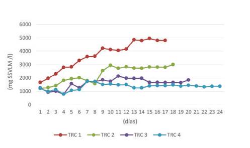 Comportamiento de remoción de sustrato y de crecimiento celular en función del TRC. Las figuras 3 y 4 representan la influencia de los valores de TRC establecidos sobre la eficiencia de remoción de sustrato y la biomasa presente en el reactor (SSVLM).