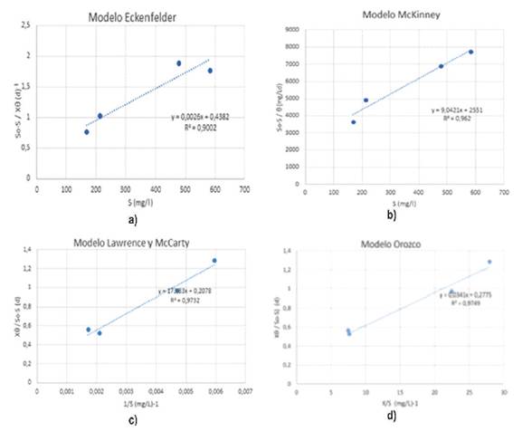 De acuerdo con la figura 5, los datos obtenidos experimentalmente se ajustaron mayormente a los modelos matemáticos de Lawrence y McCarty y Orozco con una correlación de 0.97. De acuerdo con Romero (2005) algunos modelos como el descrito por Eckenfelder, pueden presentar limitaciones para sustratos con concentraciones muy altas, como la inhibición por sustrato, donde hay una disminución progresiva de la actividad a altas concentraciones, por lo tanto, son poco aplicables para sistemas de tratamiento en condiciones de abundancia (CA).