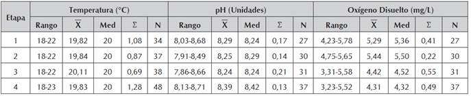 En cuanto al Oxígeno Disuelto (OD), las concentraciones promedio en las 4 etapas estuvieron en el rango 4.31 y 5.58 mg/L en general valores altos que facilitan la oxidación de la materia orgánica. Giraldo y Restrepo (2003), señala que se debe asegurar una concentración entre 1 y 3 mg/L para controlar el desarrollo de organismos filamentosos ocasionado por sobreaireación, sin embargo, en otro estudio se encontró poca influencia al disminuir la concentración a 3 mg/L en cuanto a la calidad del floc formado (Rodriguez y Osorio, 2014). En general se estima que, la cantidad de oxígeno requerida oscila entre el 15-30% de la demanda química de oxígeno (DQO) soluble removida (Peng, 2003).