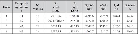 En la Tabla 2 se muestran los tiempos de retención hidráulico y de retención celular con los que fue evaluado el sistema para cada una de las cuatro etapas, como también los caudales suministrados a la entrada del sistema. La razón de variar los tiempos de retención hidráulico y de retención celular (correspondiente a cada etapa) se debe a que para la determinación de los coeficientes cinéticos, es necesario obtener datos de SSVLM y DQO en mínimo cuatro tiempos diferentes.