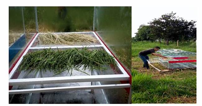 La cantidad de forraje se estimó previo ingreso de los animales a la pradera, mediante una muestra representativa del forraje de 14 praderas para el tratamiento 1, de 5 para el tratamiento 2 y 3 praderas para el tratamiento 3, utilizando el método de Mostacedo y Fredericksen (2000). Cada muestreo se sometió a secado en deshidratador artesanal basado en refracción de la luz solar por el vidrio por 48 horas (Figura 4). Las muestras se enviaron al laboratorio VILABQUIM Ltda. 500 g peso seco, para determinación de proteína cruda, fibra en detergente neutra, fibra en detergente ácida, Ca, P y Mg.