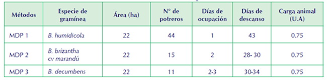 Las características de los tres métodos de pastoreo rotacional se presentan en la Tabla 1.