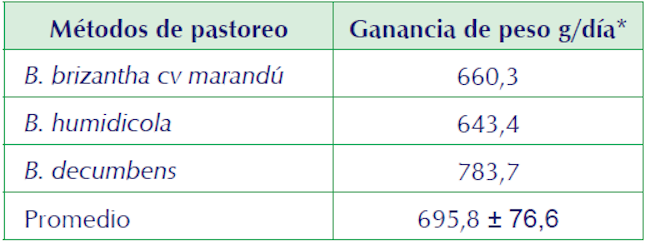 En la respuesta animal a los métodos de pastoreo, Muñoz et al., (2016) indican que el manejo del pastoreo es factor determinante en la eficiencia de los sistemas ganaderos basados en forrajes. En este sentido, la ganancia diaria de peso hallada en este trabajo fue superior a la reportada por Feria et al., (2002) en pastoreo continuo de 420 g/animal/día y en pastoreo alterno de 410 g/animal/día con pastos del género Brachiaria y a los valores obtenidos porReina et al., (2012) en pastoreo continuo de 515 g/animal/día y 700 g/animal/día en pastoreo rotacional.