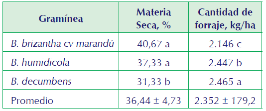 El contenido de materia seca a los valores obtenidos en B. decumbens fue inferior (P<0,05) al contenido en B. brizantha cv marandú y B. humidicola, sin embargo, la mayor cantidad de forraje (P<0,05) fue proporcionada por B. decumbens.