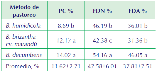 La cantidad de proteína cruda fueron inferiores (P<0,05) en B. humidicola en relación con B. brizantha cv. marandú y B. decumbens, que fueron similares entre sí. La fibra en detergente neutra fue diferente (P<0,05) para los tres métodos de pastoreo, siendo superior para B. decumbens e inferior para B. brizantha cv. marandú, a su vez la fibra en detergente acida, fue superior (P<0,05) en B. decumbens en relación con B. brizantha cv. marandú y B. humidicola.
