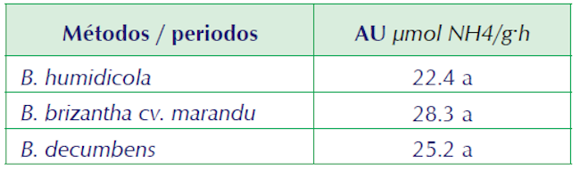 La dinámica microbiana se estimó indirectamente por la actividad de la enzima ureasa en el suelo (AU), se tomaron muestras de suelo a 20 cm de profundidad previo descapote de material vegetal. En las praderas seleccionadas se realizaron tres muestreos, uno al inicio del experimento y dos con intervalo de 40 días, las muestras fueron remitidas para análisis al laboratorio VILABQUIM Ltda mediante la técnica volumétrica de Berthelot (Granados, 2012).