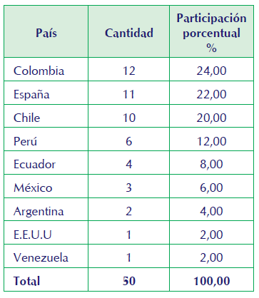 De acuerdo con los resultados y referentes teóricos que se tomaron posteriormente en el estado del arte, se puede observar a continuación, la cantidad de estudios pertenecientes a cada país y aparte de ello su respectiva participación porcentual dentro de la presente investigación.