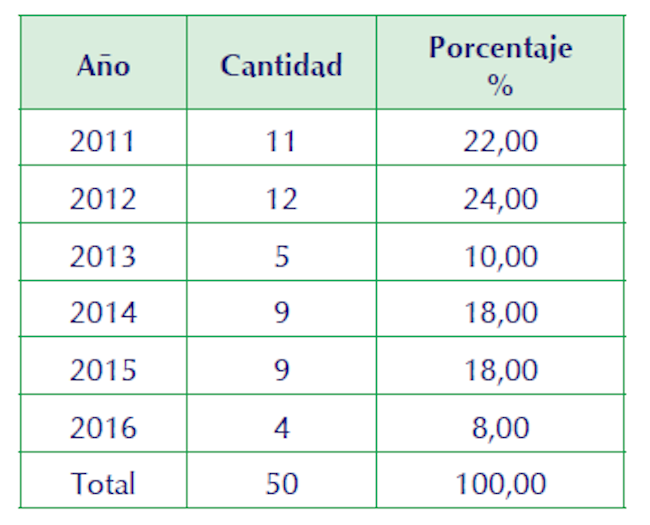 De acuerdo a la tabla anterior, se puede observar que el año en el cual más se escribió sobre el tema relacionado de la investigación es en el año 2012, el cual cuenta con un 24% de participación aproximadamente; seguido por el año 2011 con un 22% y en el tercer año de mayores resultados académicos se encuentran los años 2014-2015, teniendo ambos un 18% aproximadamente dentro del estudio realizado.