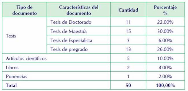 De igual manera, los resultados hallados y clasificados mediante el análisis de diferentes referentes teóricos que se tomaron posteriormente en el estado del arte, se puede observar a continuación, estos se encuentran clasificados de acuerdo a la cantidad de estudios pertenecientes a diferentes tipos de investigaciones, como lo son tesis, ponencias artículos y libros.