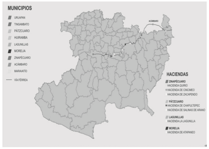 En este sentido, en lo que respecta al oriente del estado de Michoacán, la construcción de la vía férrea comenzó en el año de 1881; en este mismo año se llevó a cabo también la conexión entre Toluca y Maravatío; dos meses después se abrió el tramo de 58 kilómetros entre Acámbaro y Maravatío, y el 12 de septiembre de 1883 quedaría comunicada la capital de Michoacán con Acámbaro y Celaya por una extensión de 167 kilómetros.24
