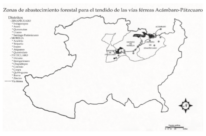 Asimismo, no hay indicios que demuestren que la madera extraída de la meseta purépecha se haya utilizado en la construcción de alguna vía férrea en la entidad durante la segunda década del siglo XX, por lo que todo hace suponer que el recurso forestal que se extrajo de las comunidades indígenas del distrito de Uruapan se distribuyó por diversas partes del país, o en su caso hacia otros países como Estados Unidos, pues la línea del Ferrocarril Nacional Mexicano (anteriormente Compañía Constructora Nacional Mexicana), comunicaba al estado de Michoacán con la ciudad de México y hasta la frontera con Laredo, Tamaulipas (para la segunda década del siglo XX estaban por construirse diversos tramos ferroviarios en el país, entre los que destacaban el de Tampico-El Higo, Cañitas-Durango y Saltillo al Oriente).56