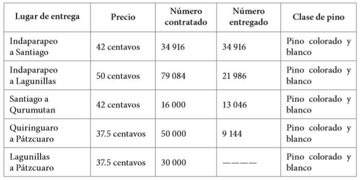 Por su parte Fernández se obligó a entregar a Slade la cantidad de seiscientos mil durmientes de pino y doscientos mil de encino cada año.55 Es decir, estamos hablando que durante los cinco años que duró el contrato entre ambos empresarios, Fernández elaboró cuatro millones de durmientes, si nos ajustamos al criterio aritmético del cuadro 2, esto representó dos millones de árboles talados solamente en lo que refiere a una parte de la meseta purépecha, lo que constituyó una enorme cantidad de madera que era destinada para el ferrocarril, esto sin contar las vigas, tablas, morillos que se aserraban en el monte.