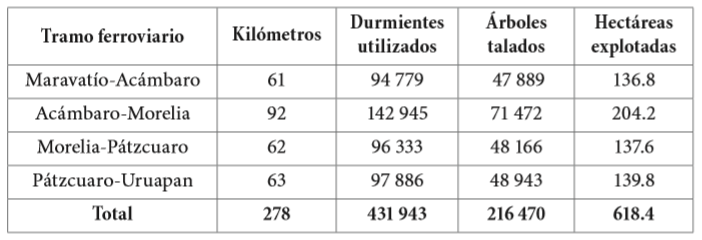 En este contexto podemos tener una idea más precisa de la cantidad de madera que se necesitó para el cimiento de los rieles. A manera de hacer cálculos aritméticos y medir el impacto forestal, podemos hacer el siguiente ejercicio: si partimos de la idea de que para una milla (1 609 metros) de vía ferrocarrilera se necesitaban 2 500 durmientes y si tomamos como referencia que de cada árbol se podían sacar dos durmientes, era preciso cortar 1 250 árboles para una sola milla (1.6 kilómetros), ó 1 250 000 para 1 000 millas de camino (1 600 kilómetros), con una distancia de 64 centímetros de centro a centro, entre un durmiente a otro. A esto hay que agregar que los durmientes se removían cada seis años. Cabe mencionar que dicha información es citada por Alejandro Tortolero en su obra Notarios y agricultores, en la cual toma como base de la fuente una nota periodística que apareció en El economista Mexicano de 1904, donde algunos viajeros como Raoul Bigot y H. Scowgall señalaron la aguda explotación de los bosques en la república mexicana, lo que les permitió hacer algunas estimaciones sobre el consumo de madera destinada para el ferrocarril.41 A partir de estos datos se realizó un análisis específico sobre el número de hectáreas que se deforestaron para la construcción de las vías férreas entre los tramos de Acámbaro a Morelia y Morelia a Uruapan, información que aparece más detallada en el siguiente recuadro.
