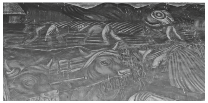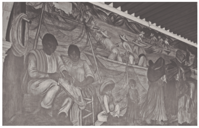 Detalle del mural Paisaje y economía de Michoacán (1934) de Marion Greenwood, localizado en el Colegio de San Nicolás de Hidalgo de la Universidad Michoacana, Morelia, México.