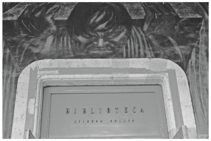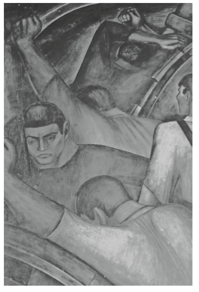 Ahora bien, el mural La industria moderna de Ryah Ludins y el de Grace Greenwood Hombre y máquina,84 hacen referencia a los obreros y a la industria, sin embargo el de Ludins fue cubierto durante el gobierno de Rafael Sánchez Tapia, sucesor de Benigno Serrato; sucedería lo mismo con la La lucha contra la guerra y el fascismo de Philip Guston, Reube Kadish y Jules Langsner.85 El fresco de Grace es el único que se preserva de los que fueron plasmados durante el rectorado de Gustavo Corona Figueroa. ¿Por qué la obra de Grace no fue cubierta? Quizá por mostrar una iconografía distinta y por localizarse en un espacio pequeño.
