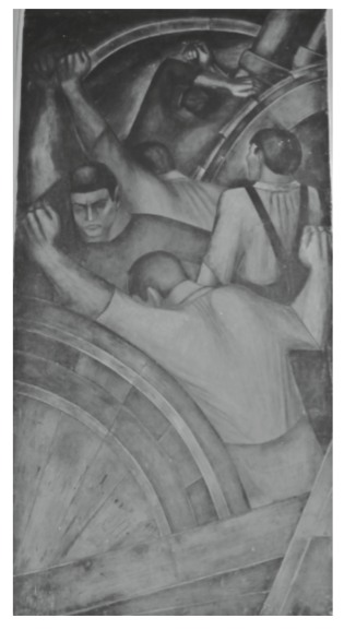 La temática que presentó Grace Greenwood en Hombre y máquina83 representa una crítica a la industria que desplazó las labores artesanales. Los hombres entre los engranajes simbolizan cómo las máquinas van sustituyendo la fabricación de objetos que antes eran elaborados con las manos e instrumentos rudimentarios. Es decir, este mural expuso la preocupación de los artistas, escritores e intelectuales estadounidenses de la época, ya que concibieron que la industrialización y la tecnología provocarían la desaparición de la vida rural tradicional mexicana (imagen 5).