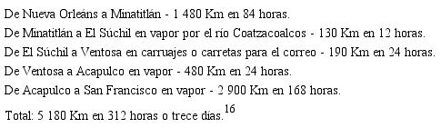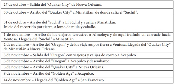 El "Oregon" zarpaba al séptimo día hacia el puerto de Acapulco, donde bajaban pasaje, carga y correspondencia para aguardar el arribo de otro vapor de la misma pmsc que, procedente de Panamá, los iba a recoger y llevar a California.28 Al fin, después de seis jornadas de navegación, los viajeros podían avistar el puerto de San Francisco. Culminaba así un periplo promedio de catorce días, que el Sacramento Union no tuvo empacho en declarar "una completa revolución en nuestras relaciones postales con el resto de la Unión" y el exaltado Alta California refirió como "uno de los sucesos más importantes de nuestro tiempo [...] Un paso gigantesco en la marcha del progreso y otro impulso para la prosperidad de California".29