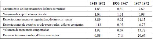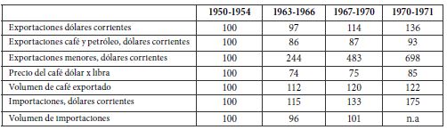 Las medidas cambiarias tuvieron otro efecto, atraer capital extranjero para asociarse con el nacional en la formación de nuevos establecimientos industriales, si bien no se modificó la tendencia general, caracterizada por los ínfimos niveles de inversión extranjera. Estos hechos pueden observarse en la tabla 1. Ante todo, el salto de las exportaciones, medidas en dólares, a partir de 1967, que ya no dependen del café y el petróleo, pues como se observa su monto no alcanzó el de principios de los años 50, dado que aunque se exportaran crecientes volúmenes, el precio continuó estando bajo. Mientras eso ocurría, las exportaciones menores muestran un crecimiento sorprendente, máxime si se tiene en cuenta que las condiciones internacionales eran cada vez más adversas. El resultado, nuevamente corroborado, es que las importaciones aumentaron medidas tanto en dólares como en volumen.