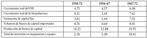 El conjunto de indicadores macroeconómicos relacionados con el PIB, tanto el total como el industrial, fue muy alentador y da pie a la generalizada afirmación de que el cuatrienio 1966-1970 ha sido uno de los de mejor desempeño en la historia económica nacional, y dio impulso a los años siguientes. La tabla 2 muestra algunos de los indicadores domésticos fundamentales. Para todos los datos analizados se observa que el promedio del período 1967-72 fue superior, en todos los casos, al promedio de todo el período 1950-72, en algunos momentos duplicándolo como ocurre en la formación de capital fijo y en otros mucho más que triplicándolo, en particular en relación con la inversión en bienes de capital y en las importaciones.
