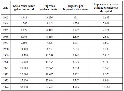 El crecimiento significó una más activa participación del Estado en las rentas nacionales como lo muestran los siguientes datos sobre las finanzas públicas. Es un efecto de doble sentido, de acuerdo con lo que se observa en la tabla 4. Hay un aumento de unas cuatro veces en el gasto público entre 1963 y 1970, similar a los ingresos del mismo Estado. Las fuentes internas fundamentales de financiación del gobierno central también crecieron unas cuatro veces, pero los impuestos de aduana lo hicieron unas seis veces en el mismo lapso, sin que, como queda visto, se afectara el grado de apertura.