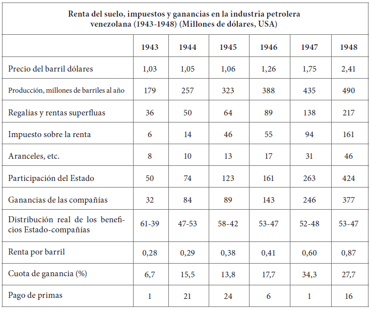 Fuente: EEUU de Venezuela, Ministerio de Fomento, Oficina Técnica de Hidrocarburos. Anuario Petrolero de Venezuela, edición de 1949, pp. 88-133.Este modelo de arreglo con los estados propietarios de petróleo, según Mommer, fue puesto en práctica por las compañías arrendatarias también en el Medio Oriente. En 1950, en Arabia Saudita se implantó el patrón del fifty-fifty con algunas variaciones respecto al aplicado en Venezuela. Igual ocurrió con Kuwait, Qatar y en Irak luego del golpe de Estado en contra del primer Ministro Mosadeq, en 1953.15