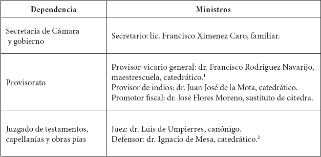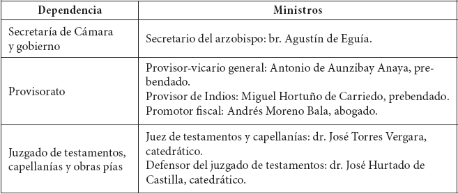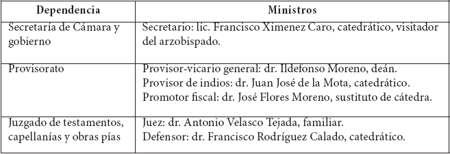 La secretaría de cámara y gobierno estaba encabezada por el secretario del arzobispo, seguido de oficiales, pajes, capellanes y asesores. Se trataba del círculo más cercano a los prelados, tanto afectiva como políticamente, y normalmente eran integrantes de la familia que traían de la península o de otra diócesis. Los secretarios de los arzobispos del siglo XVIII fueron peninsulares que por su posición desempeñaron un papel muy activo en la administración eclesiástica y que guardaron relación con prácticamente todos los sectores clericales. No obstante, su indudable defensa de los intereses del prelado los ponía siempre a distancia del clero local, por lo cual no eran la mejor opción para manejar problemáticas locales.