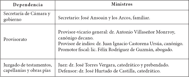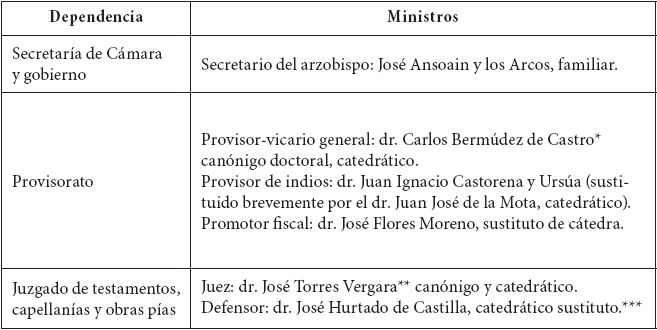 Era claro que el arzobispo Ortega había maniobrado rápido para formar un nuevo equipo en su curia, el cual estuvo conformado por su provisor-vicario general, el canónigo Antonio Aunsibay Anaya; su juez de testamentos, el cura de catedral José Torres Vergara; el defensor de este mismo tribunal, José Hurtado de Castilla, catedrático sustituto; el canónigo Miguel González de Valdeosera, administrador de la fábrica de catedral y el canónigo Rodrigo García Flores, flamante capellán de uno de los conventos más importantes de la capital.