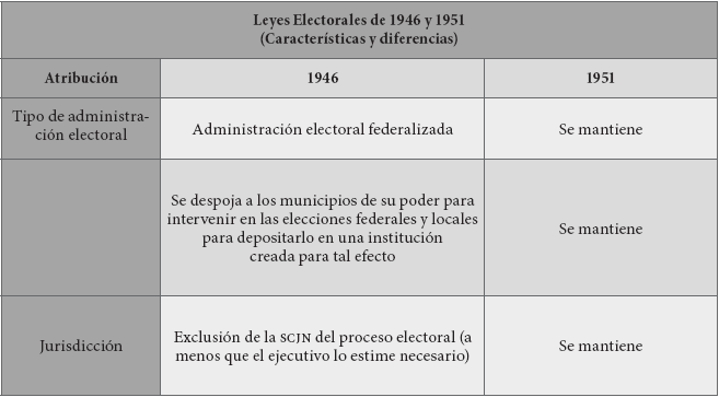 Las principales características y diferencias entre las leyes electorales de 1946 y 1951, se muestran en el siguiente cuadro: