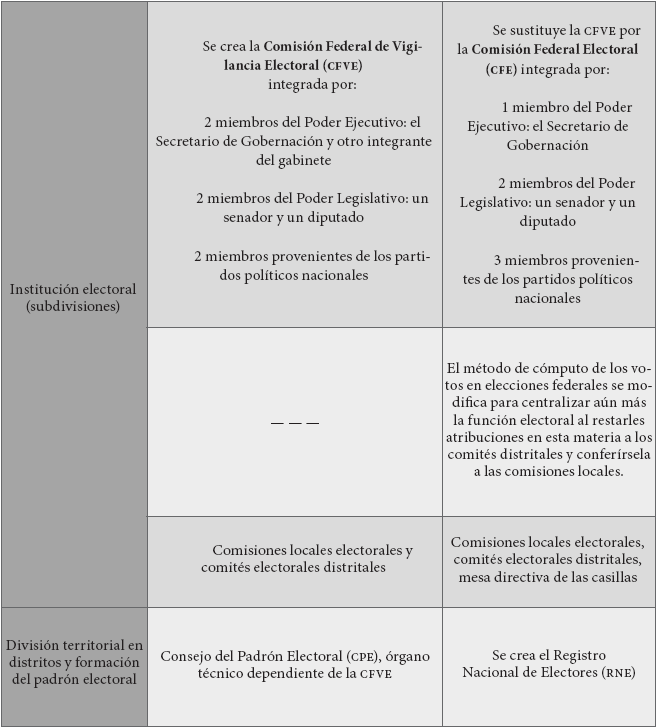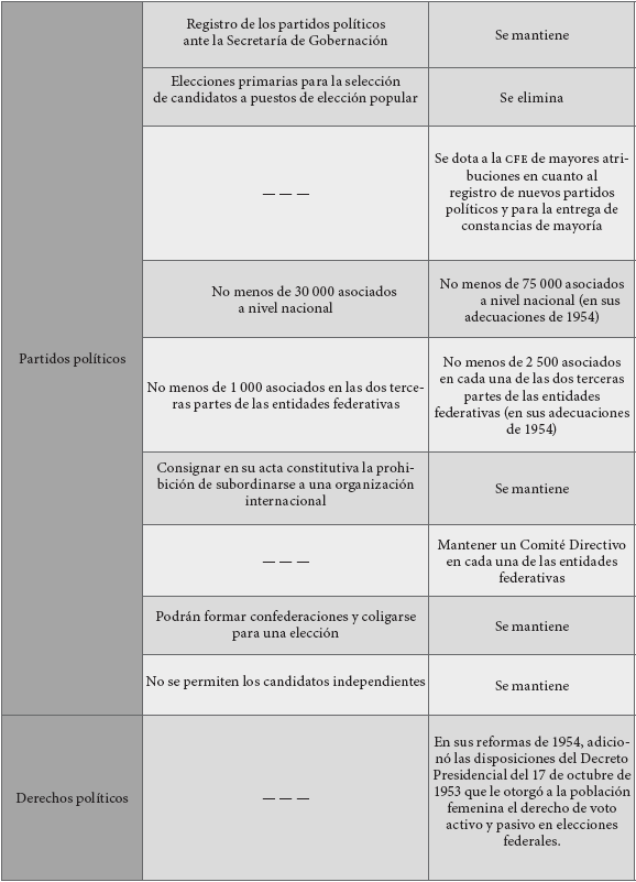 Por supuesto que un hecho de importancia nodal reside en la comparación de la ley de 1946 con la de 1951. Parecía sospechoso que, después de un cambio tan radical en el sistema electoral representado por la reforma de 1946, haya habido una nueva modificación tan solo cinco años después. La mayoría de los estudios sobre el tema señalan que la de 1951 es una nueva ley. En el terreno formal es cierto, sin embargo creemos que más que la de llevar a cabo una reforma electoral global su funcionalidad respondió a un esfuerzo para perfeccionar la reforma impulsada por Ávila Camacho para el control de la administración electoral. Gracias a ella, el régimen político mexicano pudo colocarse una máscara democrática al permitir la presencia de la oposición en la Cámara de Diputados y responder, al mismo tiempo, al reclamo de los propios sectores del partido que veían en la imposición de elecciones primarias más problemas que soluciones en la balanza de poder interior. Los principales cambios de una ley respecto a otra fueron aquellos que le brindaron mayores instrumentos de control en el registro de nuevas opciones partidistas a la CFE, por tanto una mayor concentración de funciones en el órgano electoral, que además cambia de denominación. Cambios que, para bien o para mal, fueron impulsados por la incipiente “presión” de la oposición, pues al igual que el PAN, la iniciativa pepista, aunque rechazada y menospreciada, también incidió en el resultado final de la reforma de 1951, sobre todo en lo que respecta a la conformación de la CFE, al meter en el debate la exigencia por balancear la correlación de fuerzas que tenían los distintos actores que participaban en ella y proponer por primera vez la modificación de un sistema electoral que no se daría sino casi tres décadas después.