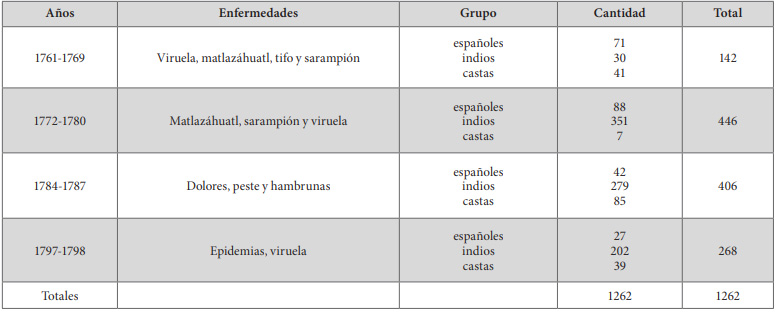 Fueron años difíciles para la población novohispana, pues no solo había que hacer frente a la crisis agrícola y a la hambruna, sino a las distintas enfermedades que diezmaron la población. Según la síntesis expuesta anteriormente, durante estos años en Valladolid expiraron 406 vidas, en su mayoría eran indios. En relación al bienio 1797-1798 en que reaparecía el problema de la viruela, se advierte una población de más de 200 infantes muertos de calidad india, comparado con el bajo índice de españoles y castas; no obstante, habrá que considerar que la traza de la ciudad dividida en barrios, las condiciones de los mismos y la cantidad de habitantes, no siempre favorecían el control de los brotes epidémicos que se presentaban.