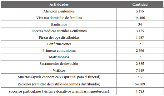 Es preciso destacar, como se observa en párrafo anterior, que en la conferencia de Salvatierra las socias debían pedir para el sostenimiento, lo cual evidencia la carencia económica de la asociación. Cabe preguntarnos por las socias honorarias, quienes solo estaban comprometidas a brindar regularmente la limosna pero que seguramente no siempre fue así y también asistían al enfermo, trabajando como activas. En el caso particular, en 1908 las señoras reportaron 65 socias activas y 103 honorarias. Aún en estas condiciones se registró que atendieron a 126 enfermos y realizaron 172 visitas a domicilio en el año.58