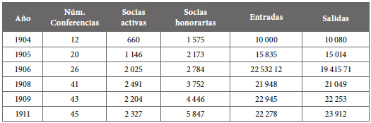Lo anterior refleja el abanico de condiciones que se presentaban en las parroquias, donde hacía presencia la cuestión económica de la población, situación que no mejoró pues la fundación de las Conferencias en los poblados antes mencionados nunca se realizó. No sucedió así en Villa Morelos, donde se integró en 1908 con 54 socias activas y 369 honorarias.48 Aún con este panorama se presentaron los párrocos y feligreses que se comprometieron y tuvieron los recursos para atender el mandato del arzobispo, observándose un aumento de las Conferencias en la arquidiócesis, principalmente en las de señoras desde 1905. Entre 1905 y 1906, el Consejo Central de Señoras, conformado por la presidenta Magdalena Videgaray de Elguero, la vicepresidenta, Soledad Moral de Iturbide, la secretaria María Ortiz Torres, y la tesorera Catalina Iturbide de Oseguera, reportó 26 Conferencias.49 El número de socias activas en 1906 fue de 2 025 y de honorarias 2 784; tuvieron entradas de 22 532 pesos y 12 centavos de los cuales gastaron 19 415 pesos y 71 centavos,50 invertidos en las acciones espirituales y de caridad. Véase cuadro 1.
