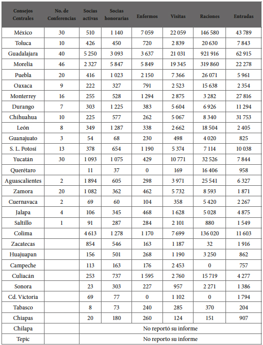 En general las Conferencias establecidas en México y en las parroquias del arzobispado de Michoacán tuvieron un crecimiento considerable. A mediados de 1911 existieron 30 consejos centrales en el país y Michoacán destacó a nivel nacional en lo que a organización de caridad se refiere contó con 2 327 socias activas y 5 847 honorarias, totalizando 8 174 miembros, solo por debajo del Consejo de Guadalajara, el más numeroso. Véase cuadro 3.