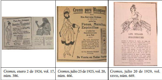 Esta focalización en el rostro es asimilada por Cromos, por ejemplo, en 1924 se presentan anuncios publicitarios para promocionar productos como Nutridor Higiénico, usado para controlar las arrugas, mientras en 1925, se publicitó una crema para blanquear y en 1929, una cera mercolizada, que en general resaltan cómo debe ser un cutis: terso, aterciopelado, límpido, libre de manchas, sin pecas, ni espinillas y hermoso. Así, el rostro limpio y blanco fue asimilado como factor de hermosura y seducción.