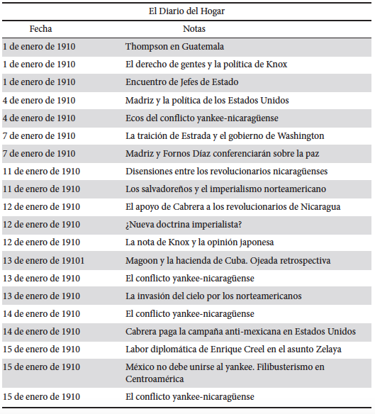 Después de este breve seguimiento hemerográfico y del agrio intercambio de notas diplomáticas de Henry L. Wilson con el Departamento de Estado y la Cancillería mexicana, podemos afirmar que El Diario del Hogar se convirtió en una fuerza política capaz de influir en la creación de líneas de opinión pública. El análisis del discurso periodístico de coyuntura devela una acentuada gringo fobia cuando sus autores se referían a la política estadounidense hacia México y América Latina, al tiempo que enfatizaban su oposición al intervencionismo en las repúblicas de Centroamérica y el Caribe. Como se puede apreciar en la Tabla I, El Diario del Hogar mantuvo una postura crítica tanto hacia el intervencionismo estadounidense, como hacia el régimen político mexicano y al gobierno de Díaz. De igual forma, el muestreo de sus encabezados y editoriales aquí realizado, lo posiciona como el órgano de expresión de un segmento de la opinión pública mexicana, perteneciente a una prensa contestataria, liberal, antireeleccionista y antiestadounidense que reforzó sus posicionamientos políticos a través de la reproducción de artículos de periódicos nacionales y extranjeros. Se trataba por tanto de un periodismo interesado en informar y formar opinión, pero también en incidir en la toma de decisiones políticas.