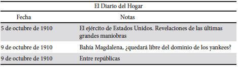 El Diario del Hogar le concedió mayor espacio a las editoriales y a la creación de columnas de opinión, referidas ex profeso a la política de Washington en la región. Mientras que la selección hemerográfica nos permite identificar dos ejes noticiosos: uno que tienen que ver con las percepciones en contra de las agresiones sufridas por los mexicanos que cruzaban la frontera; y el segundo, pone de manifiesto las posturas de crítica ante la política estadounidense en Centroamérica y el Caribe en la coyuntura de 1910. Este periódico alertaba y cuestionaba de inmediato a la administración porfirista por poner en riesgo a la soberanía de la nación. De hecho, las manifestaciones antiyanquis de noviembre de 1910 también alcanzaron al grupo de los científicos, a quienes culpaban por los enormes privilegios que les habían concedido a los estadounidenses. En este sentido, el embajador Henry L. Wilson presentó a la cancillería mexicana quejas en busca del cese de las críticas a las políticas de Washington y del colectivo de ciudadanos de origen estadounidense radicados en la República mexicana. Demandó y obtuvo asimismo el cierre del rotativo de Filomeno Mata de parte del gobierno de Díaz, atentando contra la libertad de expresión y de imprenta, que en su país constituía el llamado cuarto poder.