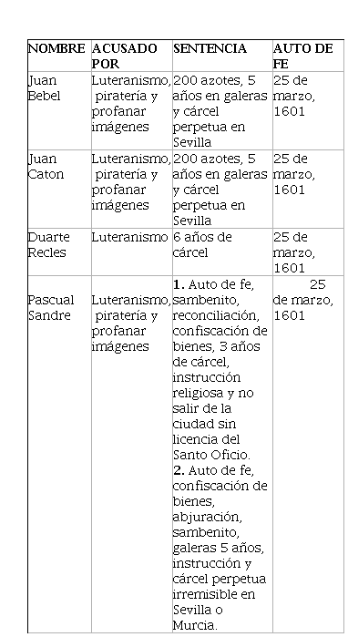 De acuerdo con Eleonora Poggio, Juan Bebel y Juan Caton fueron condenados a 200 azotes, remar en galeras por 5 años y ser trasladados a Sevilla donde cumplirían la pena de cárcel perpetua irremisible.54 Sobre el primero de ellos, Gonzalo Báez Camargo retoma la Lista Pichardo para referir lo siguiente: “Juan Bebel, inglés, natural de la ciudad de Peluma (¿Plymouth?), hereje luterano reconciliado año de 1601”.55 Por lo que toca a Caton, Báez Camargo, de acuerdo con la Lista Pichardo, menciona: “Juan Caton, inglés, natural de la ciudad de Esetar (¿Exeter?), hereje luterano, reconciliado año de 1601”.56 Cabe mencionar que los castigos recibidos por ambos marinos, fueron los que la Inquisición solía aplicar a quienes se les comprobaba el delito de herejía, como podemos observar en algunos casos seguidos a extranjeros por esos años.57