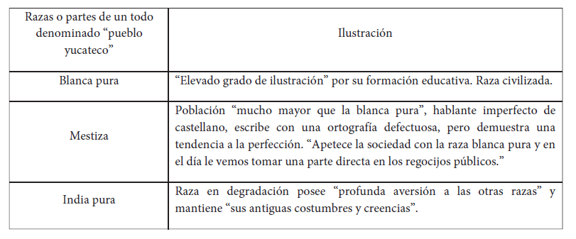 La expresión más clara del concepto raza durante el régimen monarquista fue registrada en la obra de Apolinar García García titulada: Historia de la Guerra de Castas de Yucatán, que quedó inconclusa. En ella, el concepto “raza” reunía aspectos de fenotipo y rasgos etnográficos: medio de sustento, costumbres domésticas y públicas, religión, gobierno y cultura o ilustración. De ese modo, el autor agrupó a los habitantes de Yucatán en tres razas: blanca pura, indígena pura y mestiza (mezcla de las dos primeras) por lo tanto también pura.81